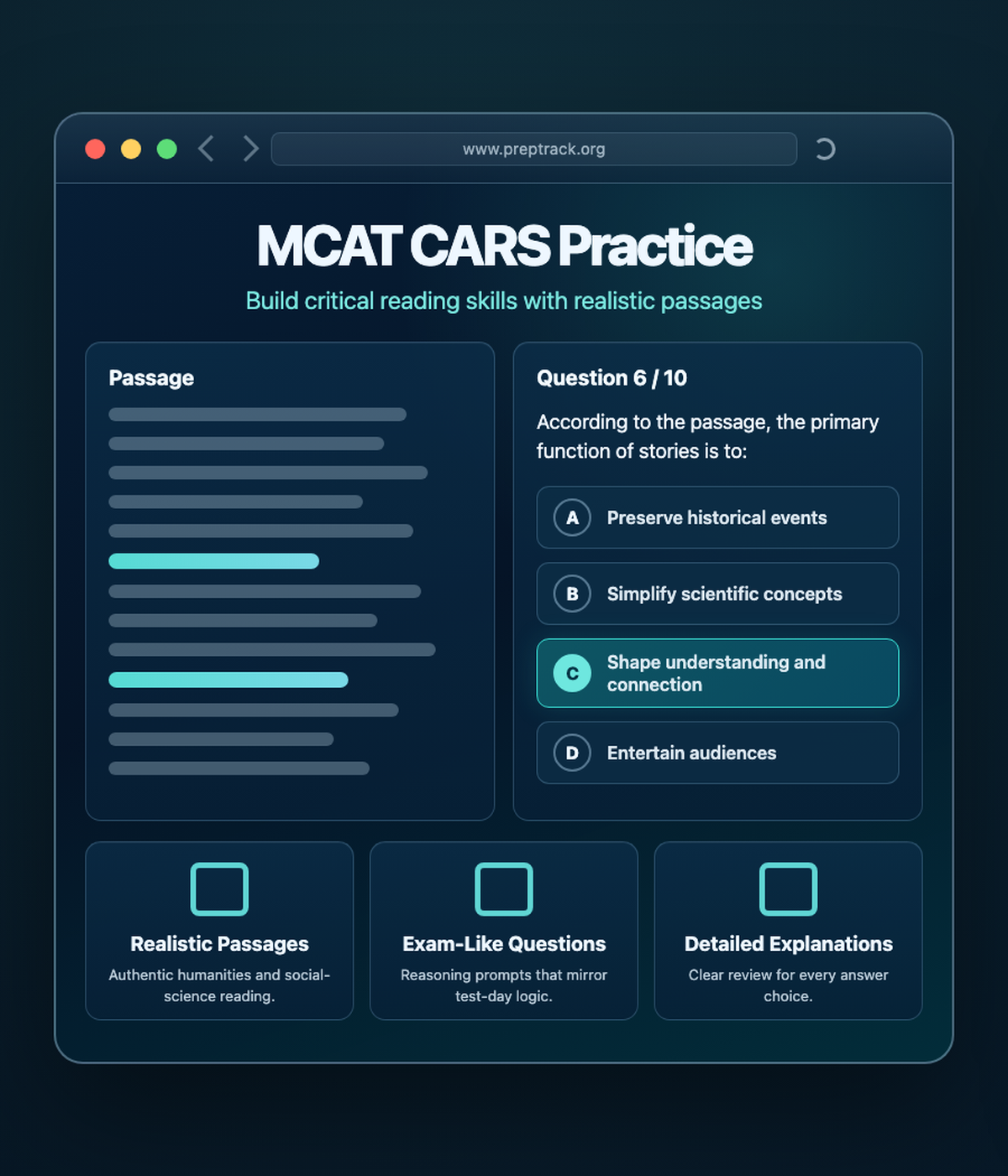 Created by 520+ MCAT scorers, PrepTrack combines CARS walkthroughs, Psych/Soc spaced repetition, and practice review into one high-performance prep system.